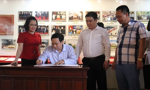 Đồng chí Phạm Đức Toàn, Phó Bí thư Đảng ủy, Phó Trưởng ban Ban Thi đua – Khen thưởng Trung ương thay mặt Đoàn viết lưu bút bày tỏ cảm tưởng, lòng kính trọng Cố Tổng Bí thư