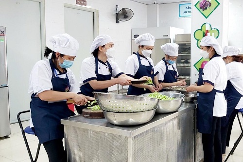 Khu bếp ăn được xây dựng theo quy trình một chiều sạch đẹp, đảm bảo đúng quy trình về vệ sinh an toàn thực phẩm
