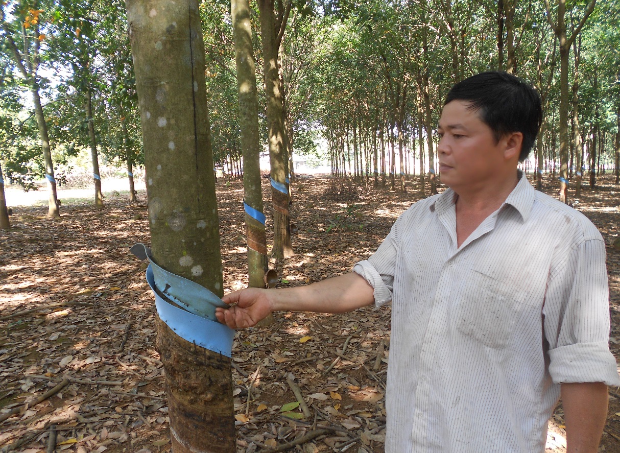 Ông La Văn Sanh kiểm tra máng cạo mủ cao su của gia đình