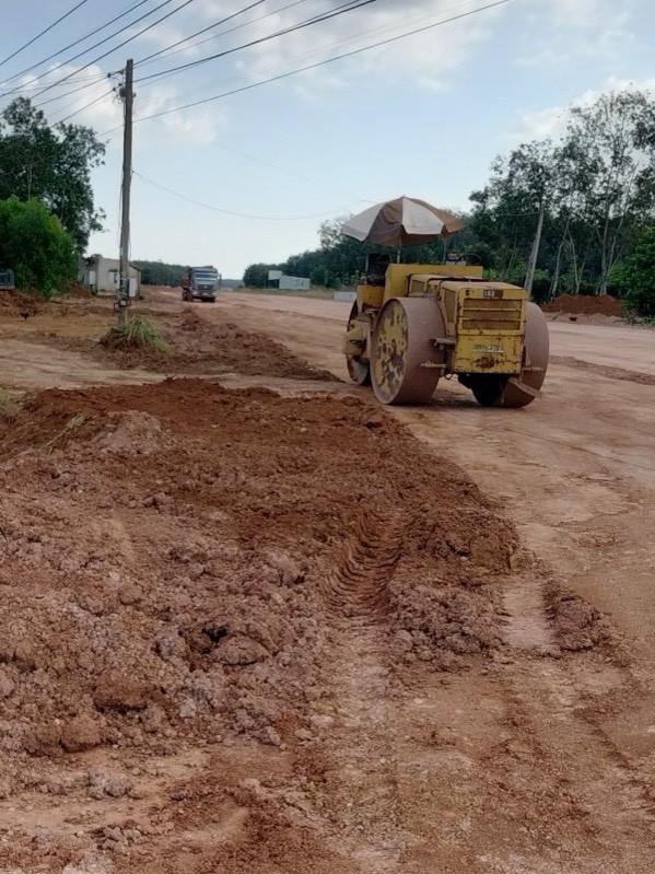 Máy cơ giới đang thi công tuyến đường trên mảnh đất do gia đình ông La Văn Sanh hiến đất