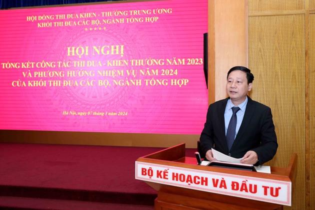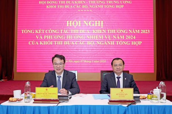 BTĐKT - Sáng 7/3, tại Hà Nội, Khối thi đua các bộ, ngành tổng hợp (Khối thi đua) tổ chức Hội nghị tổng kết công tác thi đua, khen thưởng năm 2023, triển khai phương hướng, nhiệm vụ năm 2024. Các đồng chí: Trần Quốc Phương, Thứ trưởng Bộ Kế hoạch và Đầu tư; Lê Tấn Cận, Thứ trưởng Bộ Tài chính chủ trì hội nghị.