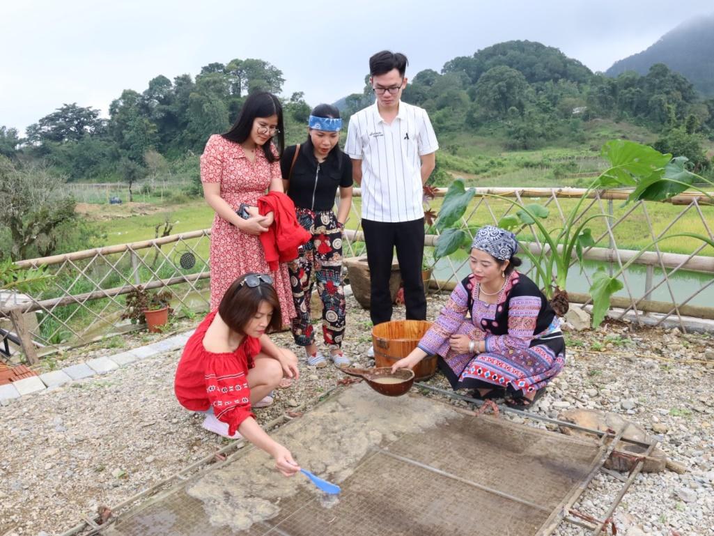Chị Sùng Y Múa hướng dẫn khách du lịch làm giấy giang