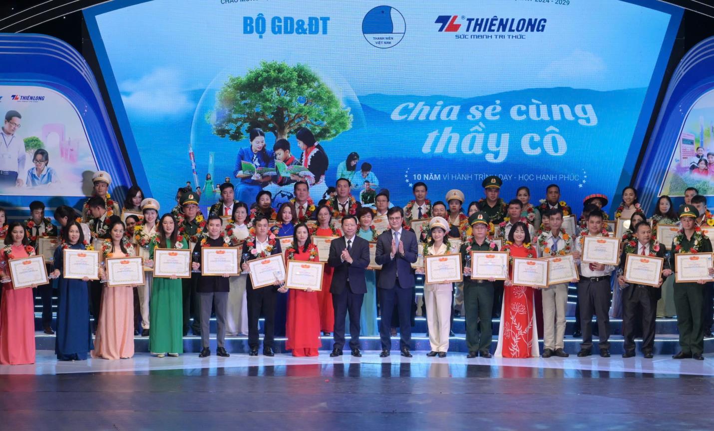 BTĐKT - Tối 15/11, tại Hà Nội, Trung ương Hội Liên hiệp Thanh niên (LHTN) Việt Nam phối hợp với Bộ Giáo dục và Đào tạo, Tập đoàn Thiên Long tổ chức Chương trình “Chia sẻ cùng thầy cô” năm 2024 - tuyên dương 60 thầy giáo, cô giáo tiêu biểu đang công tác trên mọi miền Tổ quốc.