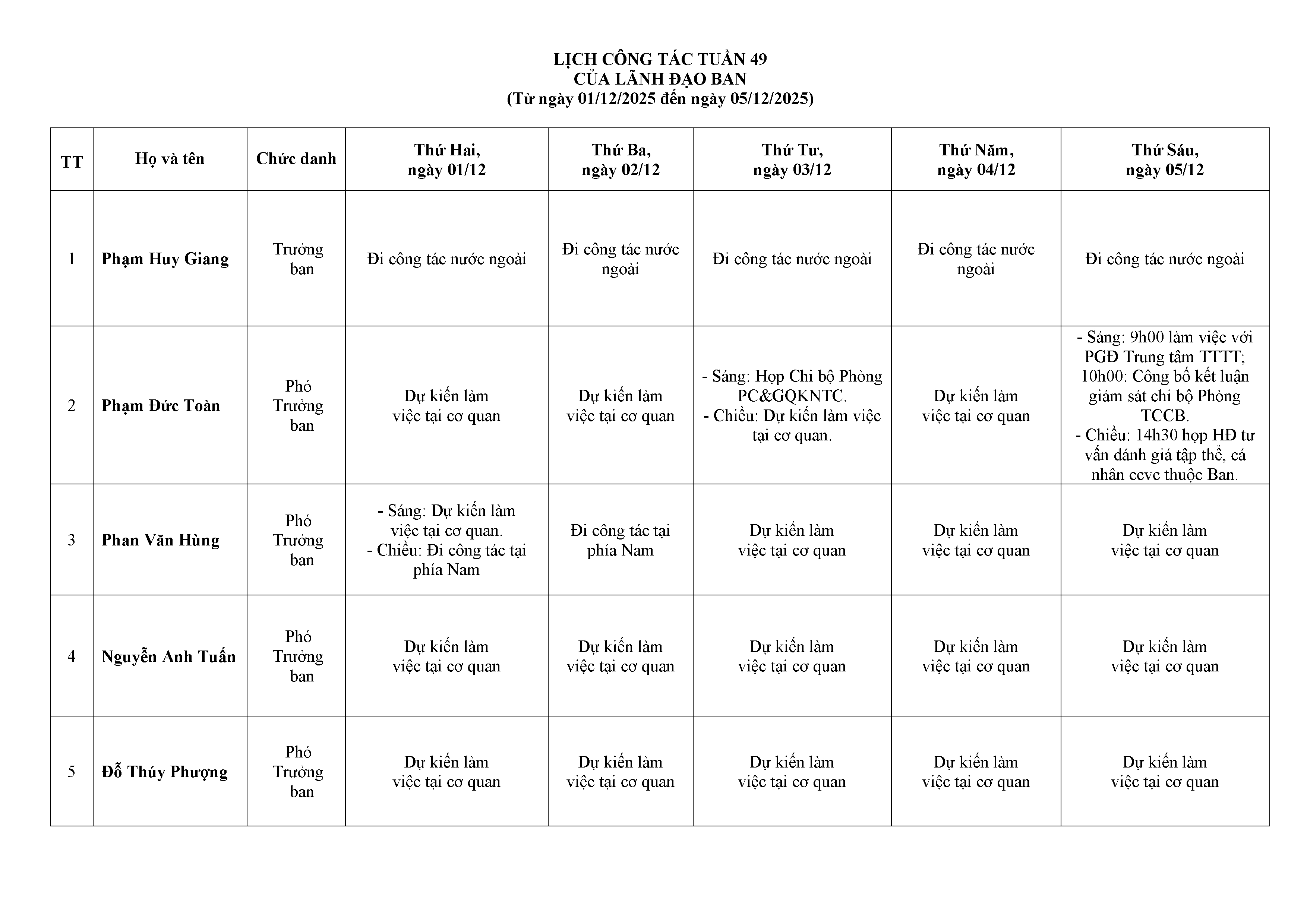 Lịch công tác của Lãnh đạo Ban từ ngày 01.12.2025 đến ngày 05.12.2025