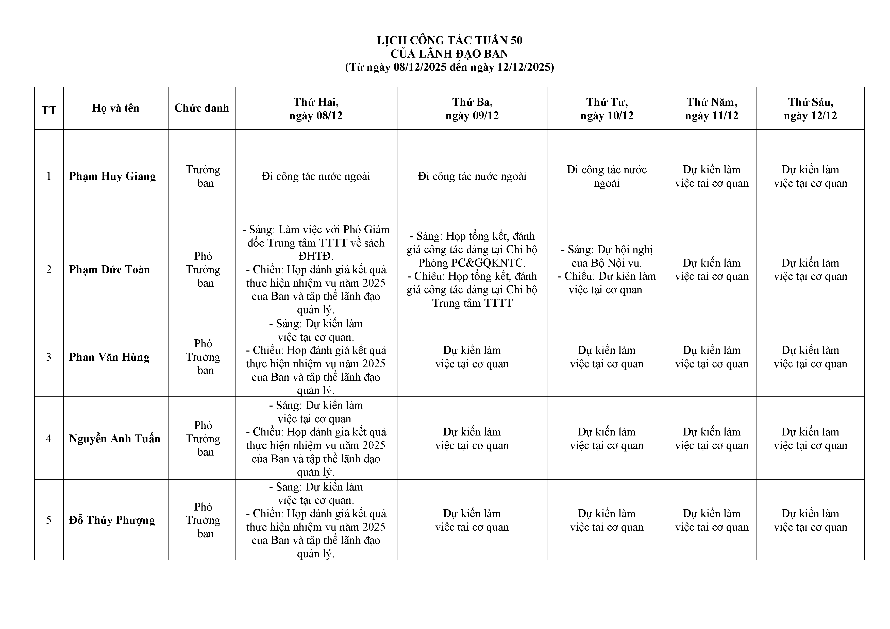 Lịch công tác của Lãnh đạo Ban từ ngày 08.12.2025 đến ngày 12.12.2025