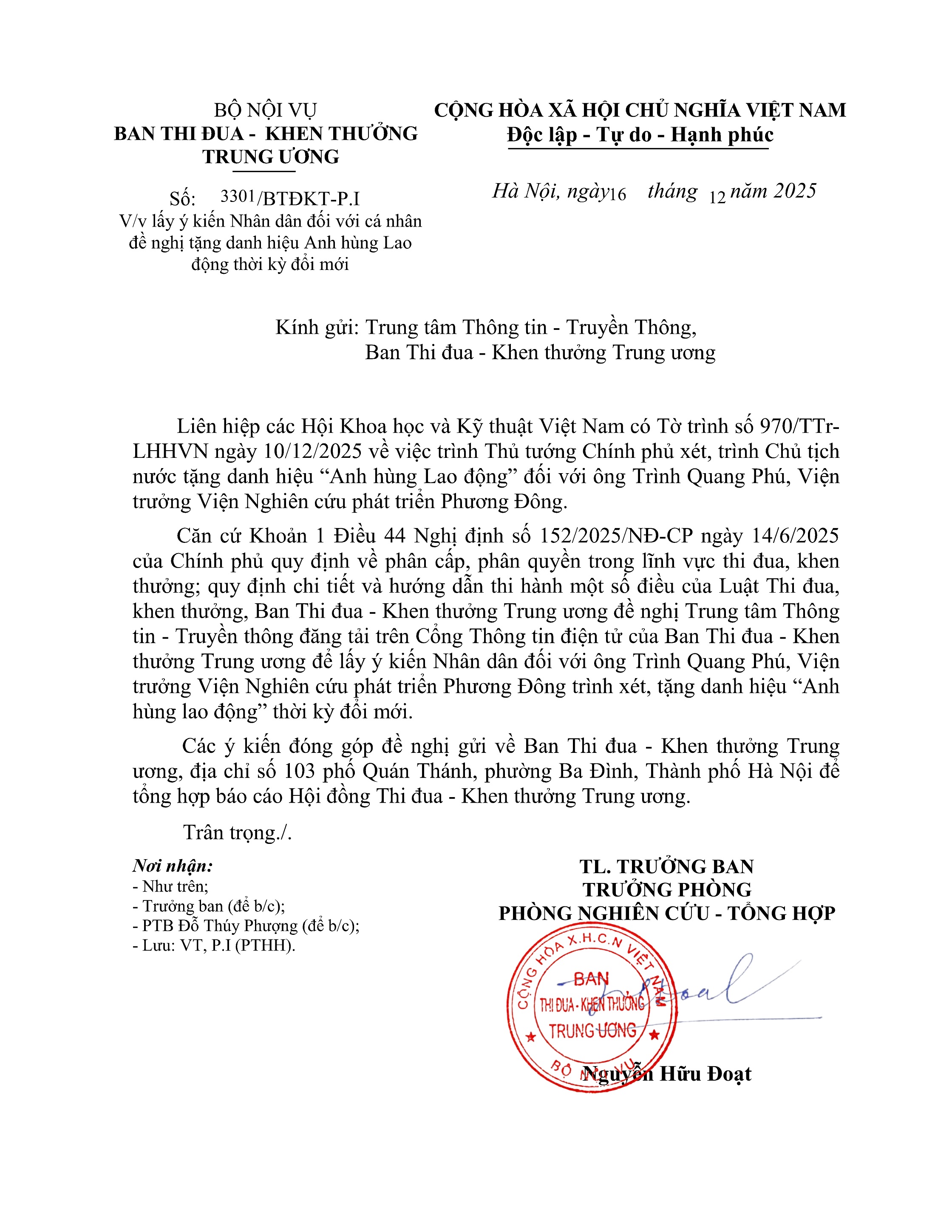 Lấy ý kiến Nhân dân đối với cá nhân đề nghị tặng danh hiệu Anh hùng Lao động thời kỳ đổi mới