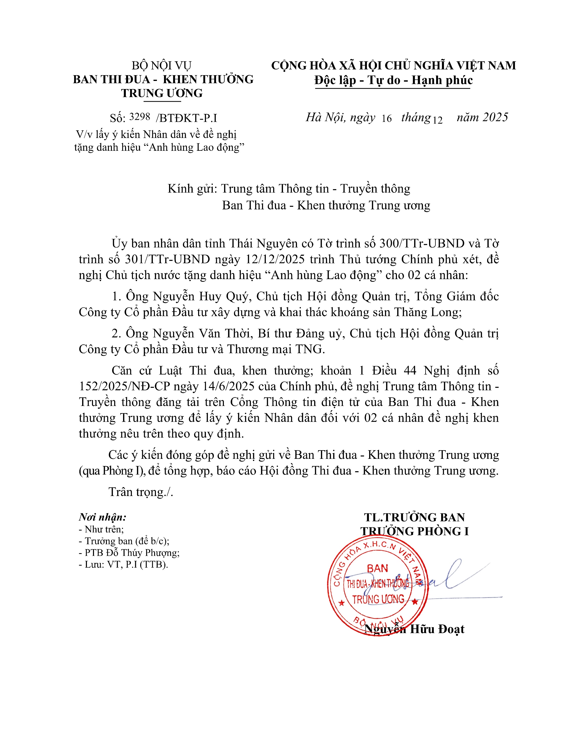 Lấy ý kiến Nhân dân đối với cá nhân đề nghị tặng danh hiệu Anh hùng Lao động thời kỳ đổi mới