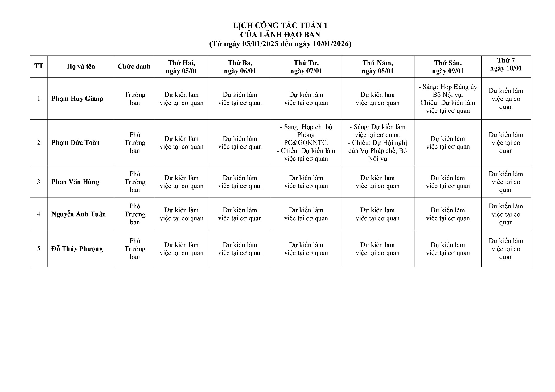 Lịch công tác của Lãnh đạo Ban từ ngày 05.01.2026 đến ngày 09.01.2026
