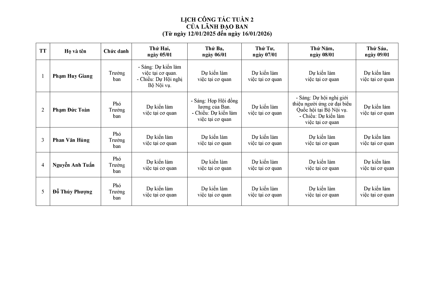 Lịch công tác của Lãnh đạo Ban từ ngày 05.01.2026 đến ngày 09.01.2026