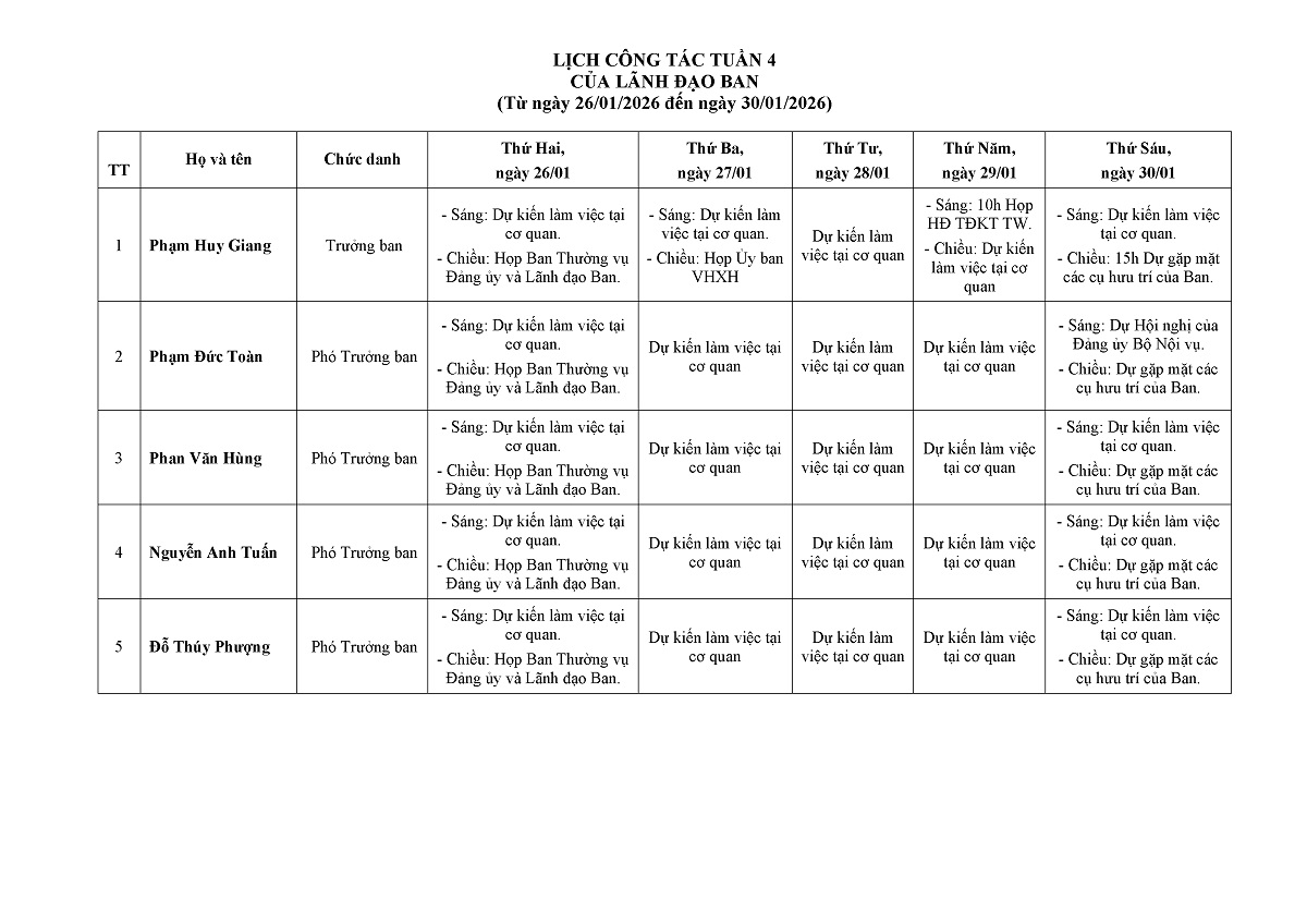 Lịch công tác của Lãnh đạo Ban từ ngày 26.01.2026 đến ngày 30.01.2026