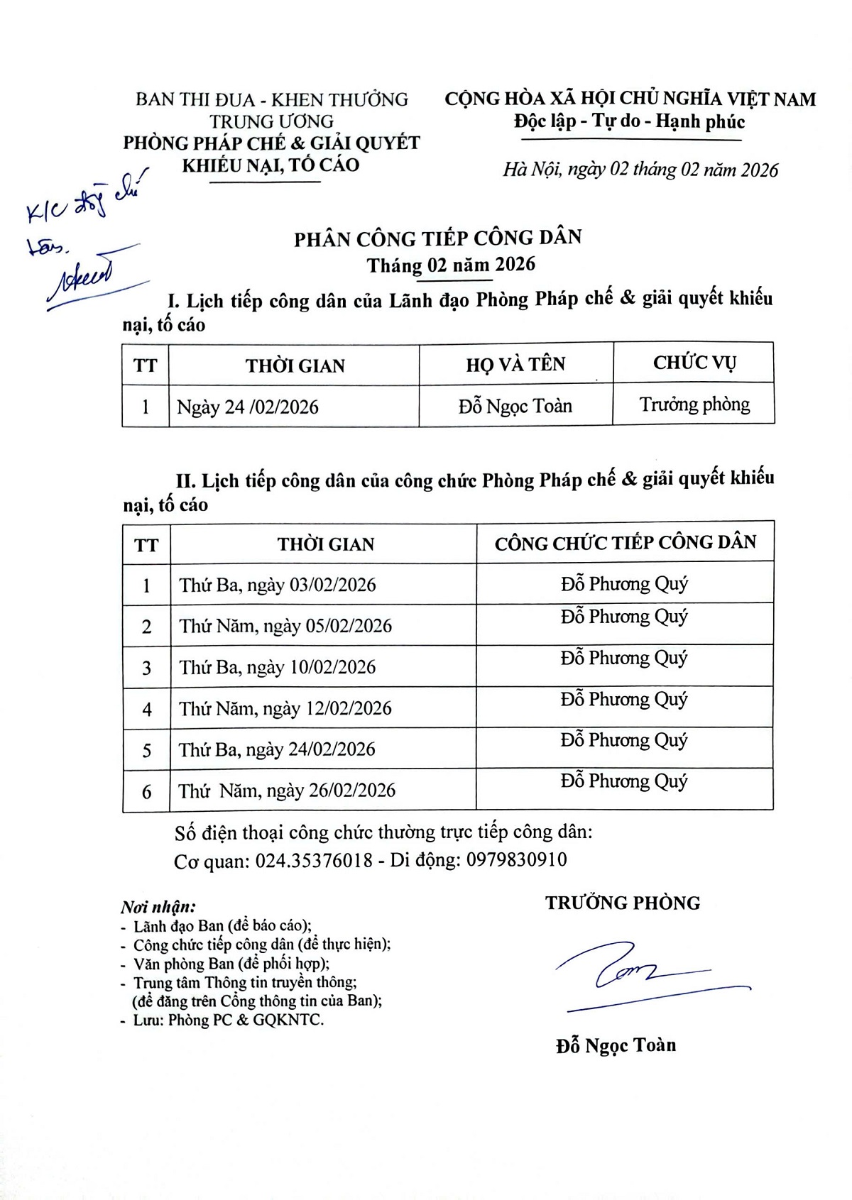 Lịch tiếp công dân tháng 02 năm 2026 của Phòng Pháp chế và giải quyết khiếu nại, tố cáo