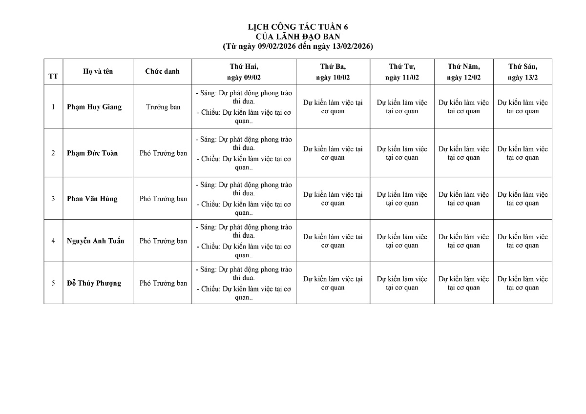 Lịch công tác của Lãnh đạo Ban từ ngày 09.02.2026 đến ngày 13.02.2026