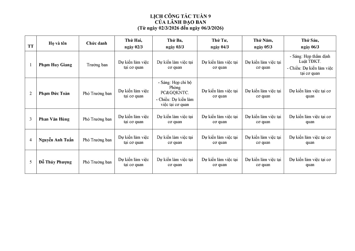 Lịch công tác của Lãnh đạo Ban từ ngày 09.3.2026 đến ngày 13.3.2026