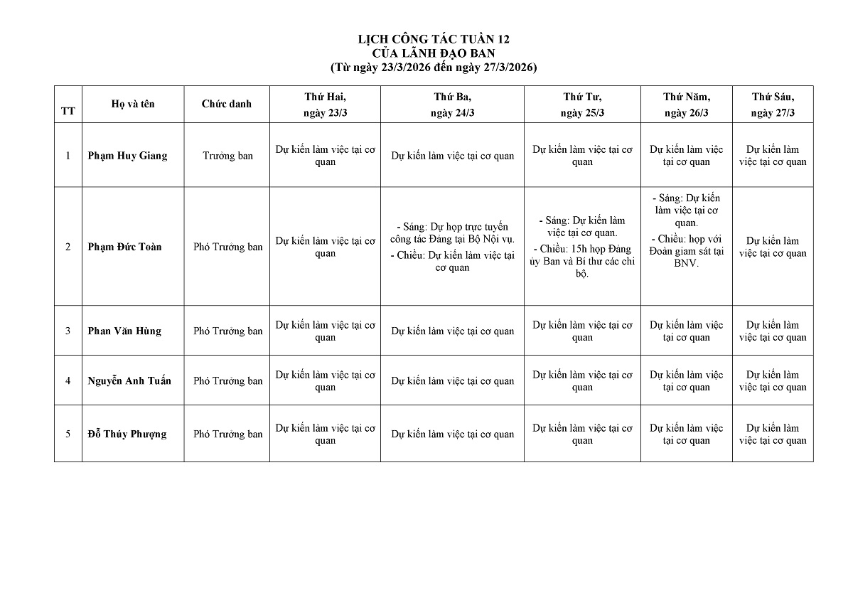 Lịch công tác của Lãnh đạo Ban từ ngày 23.3.2026 đến ngày 27.3.2026