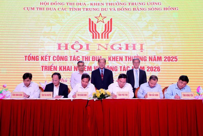 Tại hội nghị, các đại biểu đã bình xét, đề nghị Thủ tướng Chính phủ tặng Cờ thi đua cho tỉnh Phú Thọ - đơn vị dẫn đầu phong trào thi đua năm 2025; tặng Bằng khen cho hai tỉnh Bắc Ninh và Quảng Ninh. Đồng thời, thống nhất suy tôn Quảng Ninh là Cụm trưởng, Thái Nguyên là Cụm phó Cụm thi đua năm 2026; các tỉnh tiến hành ký kết giao ước thi đua năm 2026.
