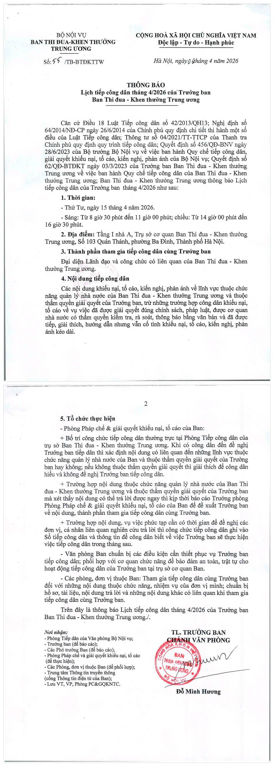 Lịch tiếp công dân tháng 04.2026 của Trưởng ban Ban Thi đua - Khen thưởng Trung ương