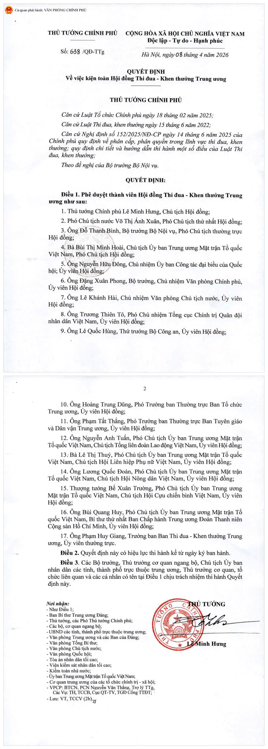 Quyết định 638 của Thủ tướng Chính phủ về việc kiện toàn Hội đồng Thi đua - Khen thưởng Trung ương