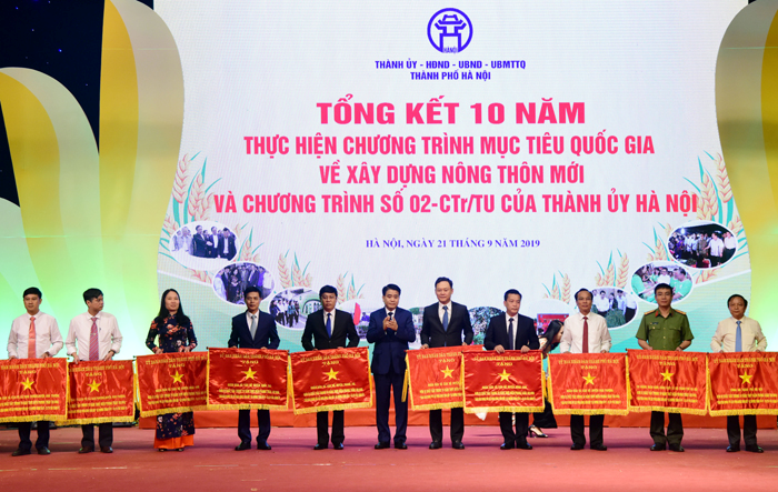 Chủ tịch UBND TP Hà Nội Nguyễn Đức Chung tặng Cờ thi đua dẫn đầu trong phong trào xây dựng nông thôn mới của TP Hà Nội cho các đơn vị