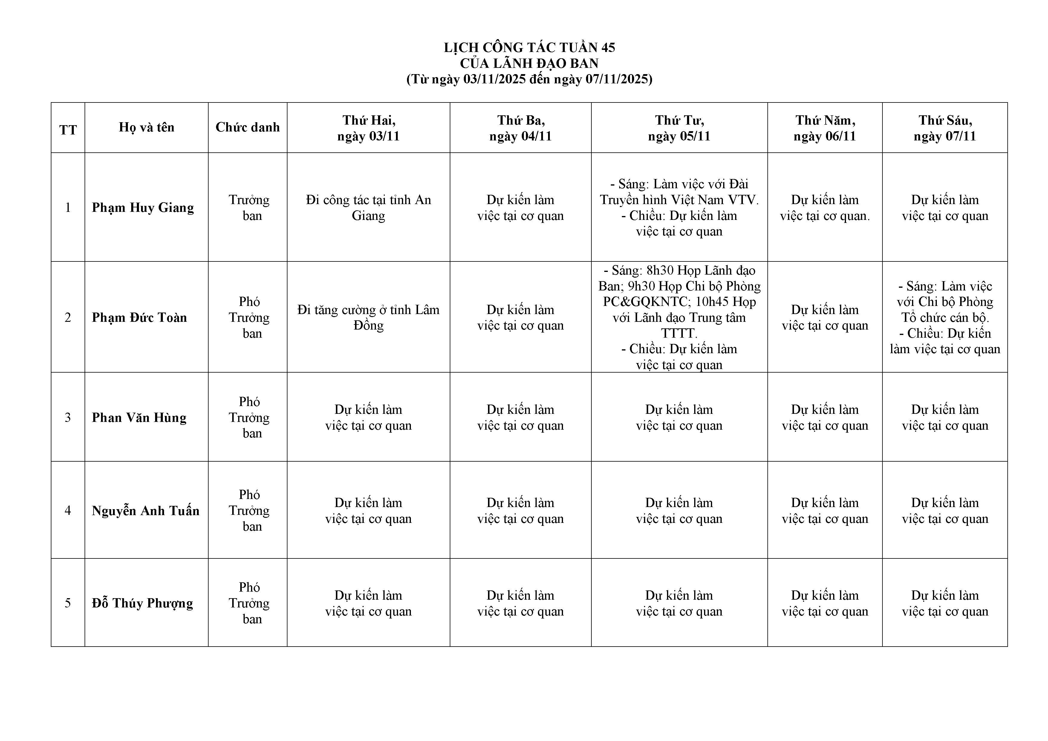 LỊCH CÔNG TÁC từ ngày 03.11.2025 đến ngày 07.11.2025