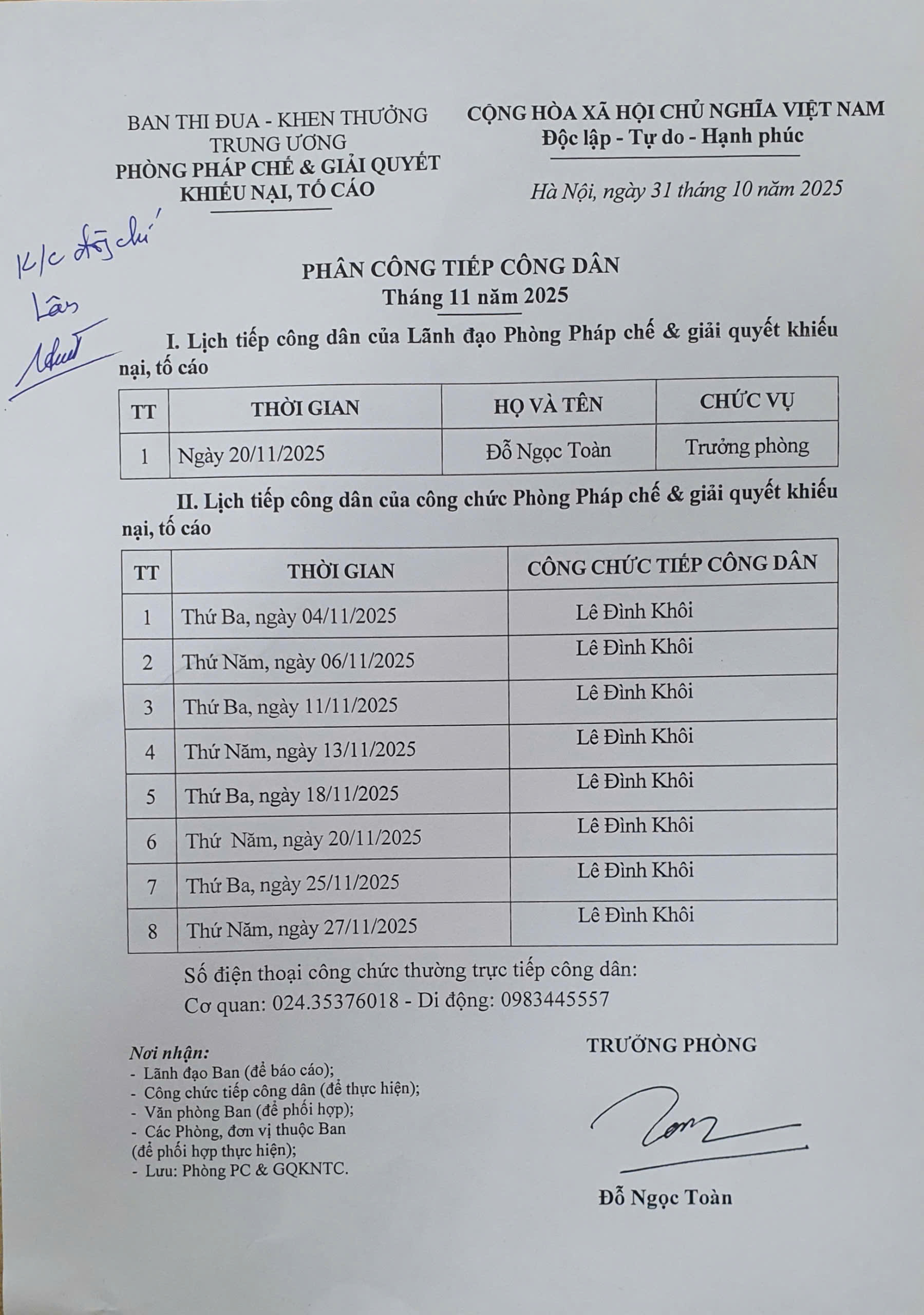 Lịch tiếp công dân tháng 11 năm 2025 của Phòng Pháp chế và giải quyết khiếu nại, tố cáo