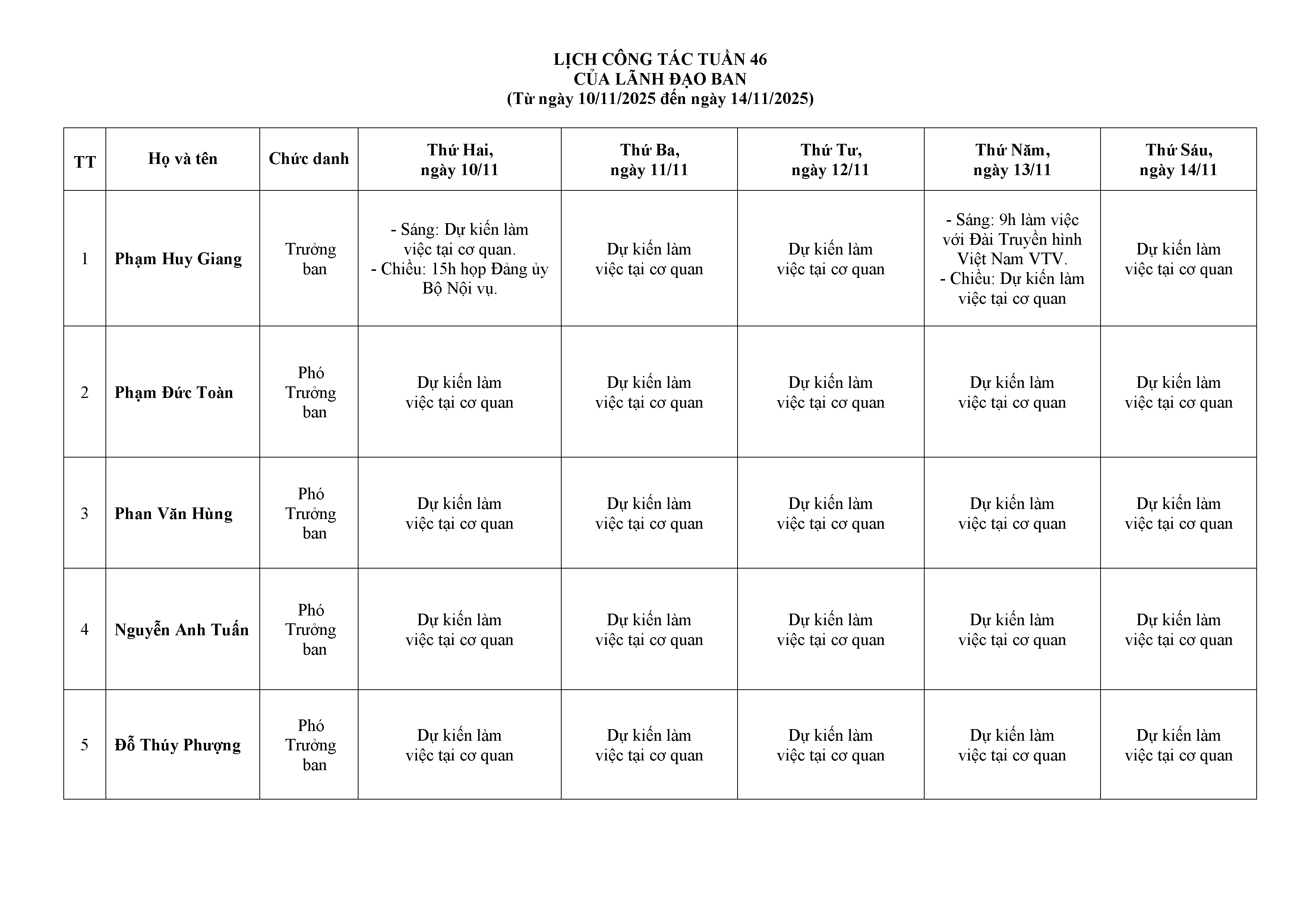 Lịch làm việc Lãnh đạo Ban