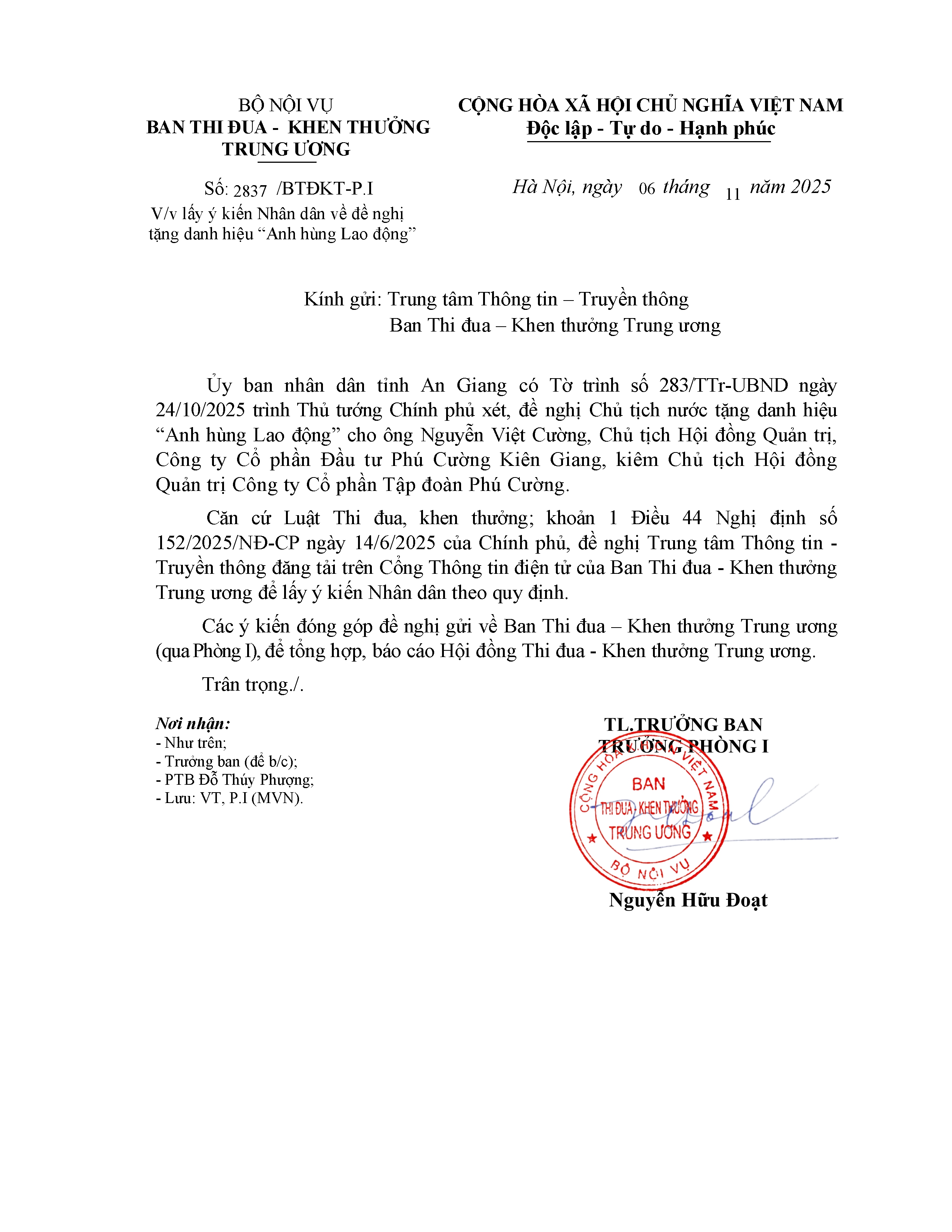 Lấy ý kiến Nhân dân đối với cá nhân đề nghị tặng danh hiệu Chiến sĩ thi đua toàn quốc