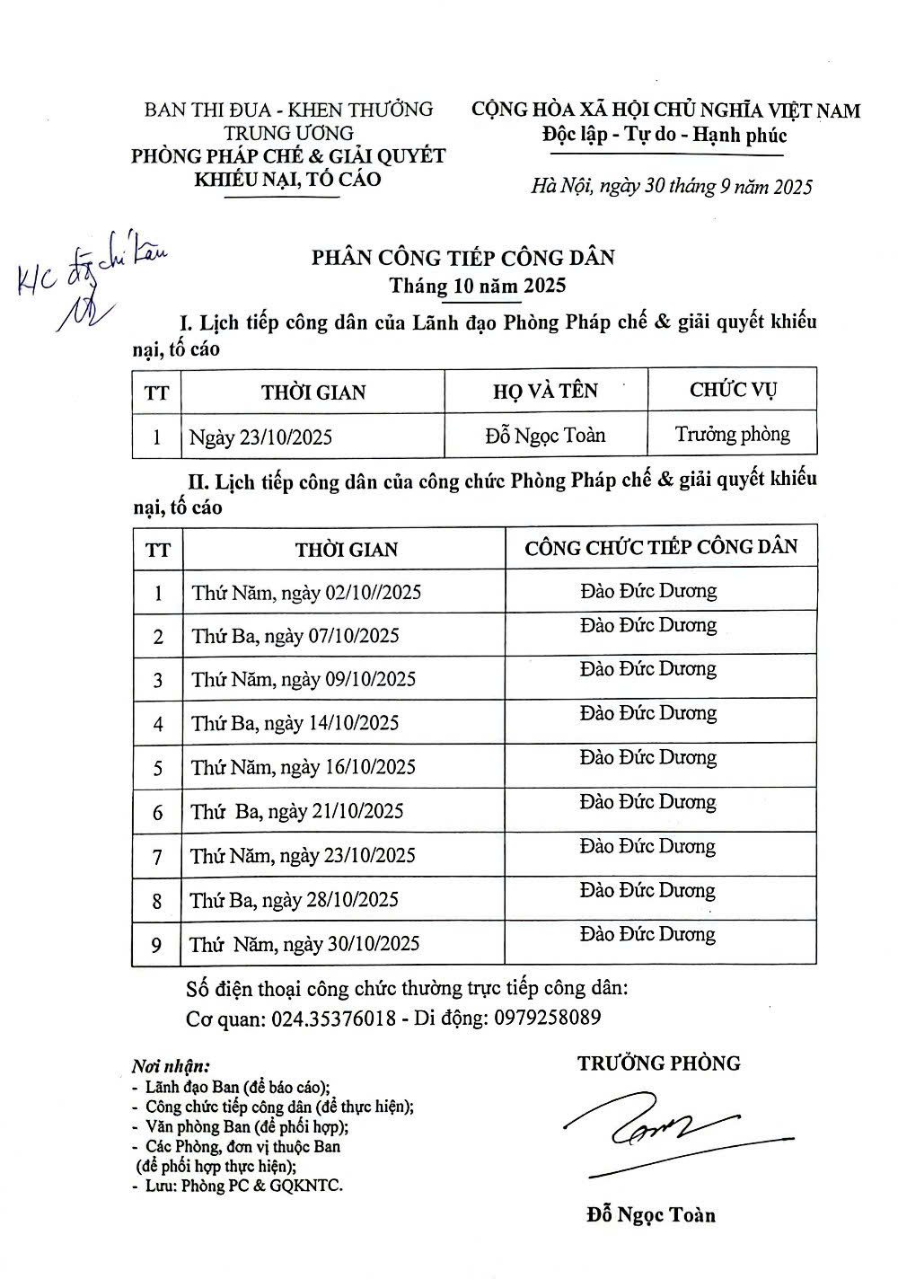 Lịch tiếp công dân tháng 10 năm 2025 của Phòng Pháp chế và giải quyết khiếu nại, tố cáo